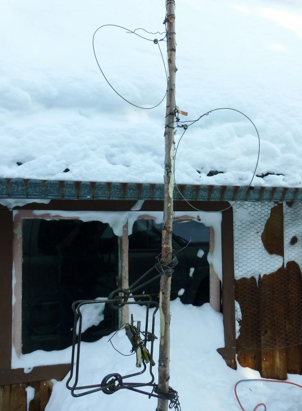 Figure 4. Pole set positioned between lodge and feed pile. Consult regulations for your state to determine if a set like this is legal.