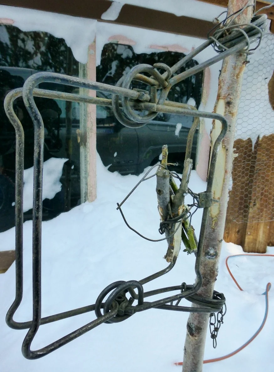 For snares, I use a 1 ½ inch nail driven in right above the blaze mark on the pole, driven in at a slight upward angle. Use a small piece of wire to hold the snare on the nail, and also create a small wire hanger to hold the snare out straight to create a circle that doesn’t sag (figure 3). Once the traps are placed, use wire to connect the snares and body-gripping trap to a log above the ice. This step is crucial because if you only attach the trap to the pole, beavers will chew up the pole and you’ll lose your traps! Once the setup is ready, take the safeties off your body gripping traps, and sink the pole through the ice slowly so the snares do not fall off the nail. Sink the pole into the bottom of the pond to secure its position. Use a cross log to secure the wires from your traps (figure 4). Finally, cover the opening in the ice with snow. I learned that covering the hole reduces the “unnatural” look of the set so even timid beavers will investigate.