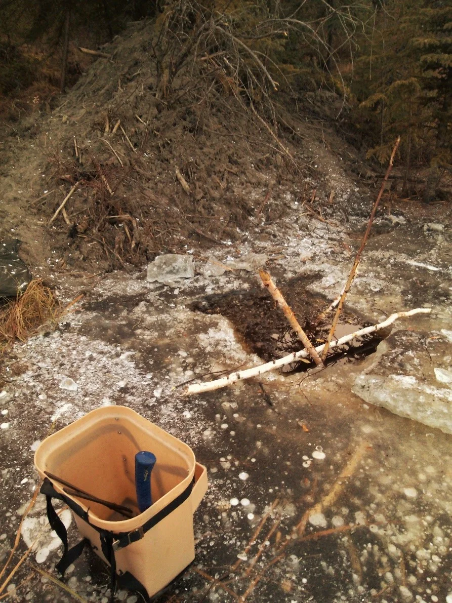 Beaver are not a popular species to trap in Interior Alaska for several reasons. The work necessary to trap beavers, preparing the pelt, low pelt value, and a myriad of other reasons persuade many trappers to avoid the hassle. Due in part to these detractors, beavers are plentiful! Rivers such as the Chena or Tanana are loaded with lodges if you know where to look. Sloughs in particular are good locations for lodges because beavers prefer slower moving water. After you spot a lodge, making sure its active is key to success. Classic signs of active beaver lodges in winter include: thin ice near the entrance to the lodge, heavy bubble trails around the lodge (if the ice is not covered in snow), and a “chimney” or snow free hole at the top of the lodge with hoarfrost or steam rising from the opening. Once you’ve located an active lodge and the beavers feed pile (twigs, branches, and larger sections of trees which beavers feed on throughout the winter) it’s a good bet that there are multiple residents, and this is an excellent location to make a set.