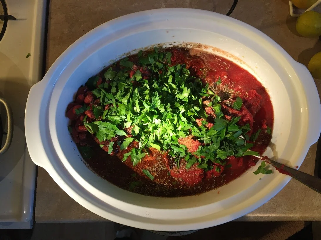 - Add all ingredients (except cilantro) to a large crockpot, cooking on the low setting for 6-8 hours.